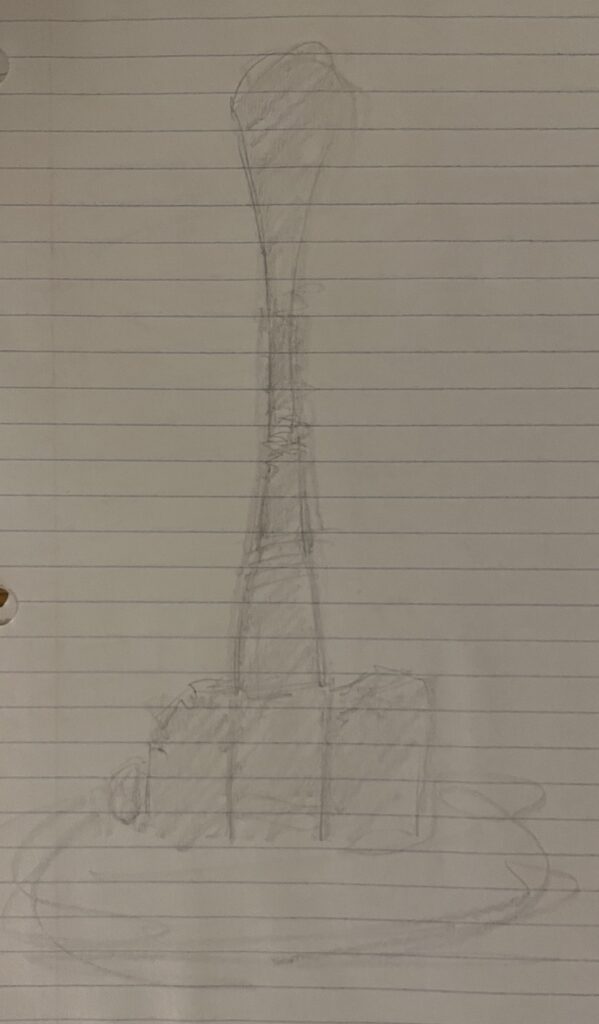 Originally in order to recreate my object I was going to use a 3D scan; however, this did not create a useable product so I chose to draw it instead. The process of drawing my object led me to think more about how simple it was. This simplicity made it quite easy for me to draw it, much easier than it would have been to draw a more ornate brooch such as the one the woman wore around her neck. This simplicity must also have been on the mind of the craftsman or men who originally created the brooch. Because the pattern for the brooch is created by the mold a more complicated brooch necessitates a more complicated mold. The time required to create these more complicated molds alongside the fact that the molds themselves had a very low rate of survival likely incentivized craftsmen to try to simplify their designs as much as possible. This pursuit of simplicity must have added further value to the much more intricate and larger square headed brooch worn under the chin. Additionally, it makes the three knobs on the square head of the brooch much more important as these fragile aspects must have held a large amount of importance otherwise they would likely have been simplified out.